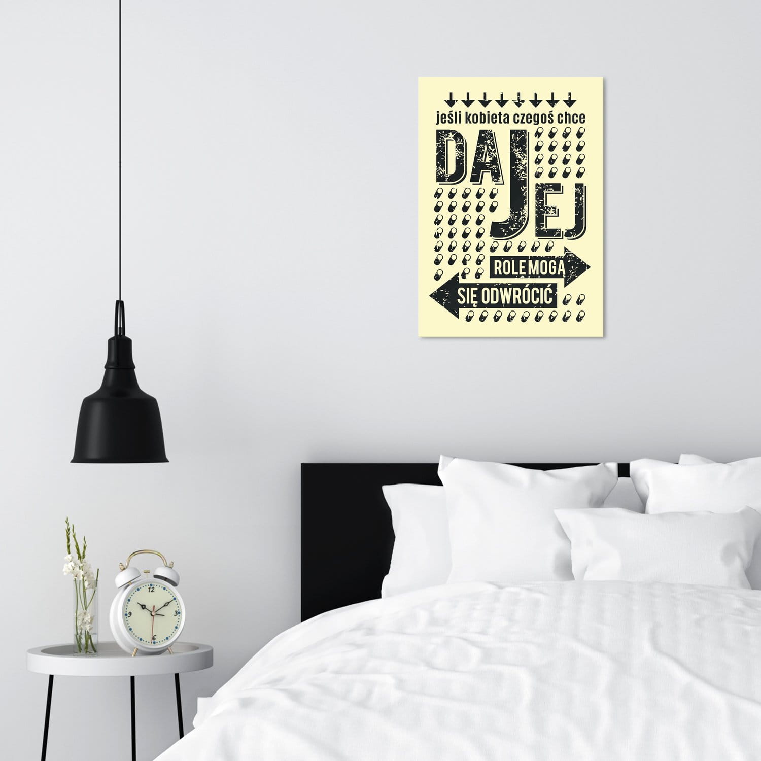 Sypialni, niezmiennie kojarzącej się ze spokojem, odpoczynkiem i wyciszeniem. Dobrze jest, gdy obrazy tam umieszczane wprowadzają w błogi nastrój i pozytywnie nastawiają do życia. A może, wręcz przeciwnie, ciekawym pomysłem będzie zwariowany plakat z humorem?
