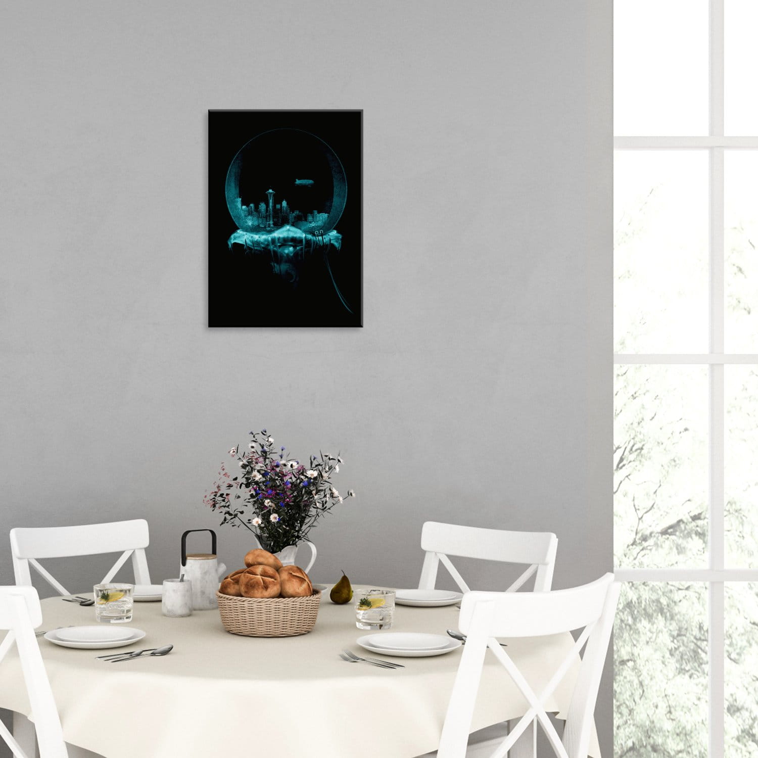Jadalni, która jest miejscem zarówno codziennych jak i bardziej uroczystych spotkań rodzinnych. Grafiki w tym pomieszczeniu mogą być stonowane i eleganckie, a także barwne i z charakterem.