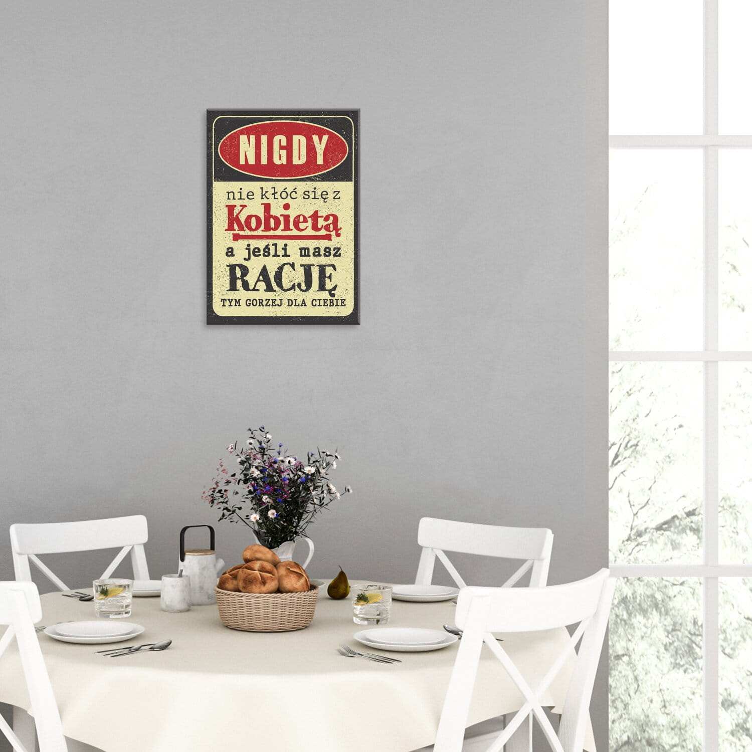 Jadalni, która jest miejscem zarówno codziennych jak i bardziej uroczystych spotkań rodzinnych. Grafiki w tym pomieszczeniu mogą być stonowane i eleganckie, a także barwne i z charakterem.